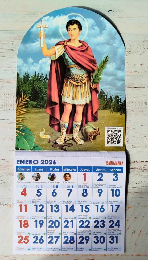 Almanaque capilla 2026 con imagen de San Expedito. Incluye oración en la parte laminada de abajo que se puede recortar, además de santoral para todo el año, colores litúrgicos para cada día, además en la parte de atrás de cada hoja están todas las lecturas de cada día de todo el mes. Posee también, un código QR para obtener el evangelio de cada día